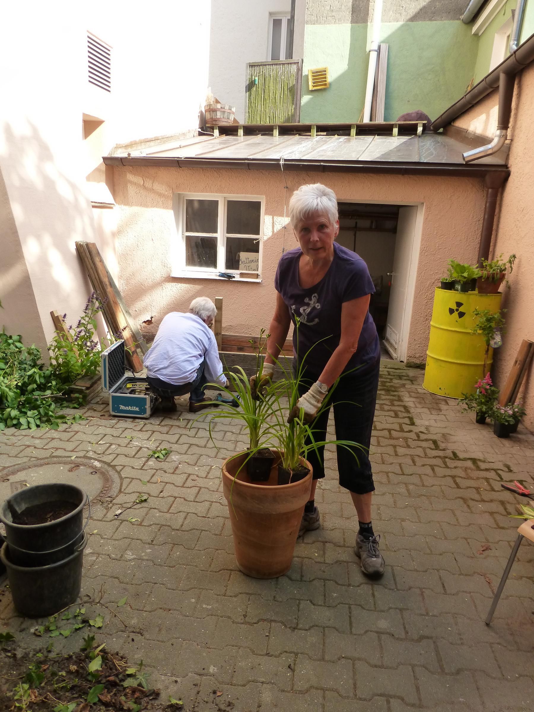 Dank der zahlreichen Blumen-, Erden-, Topf-, Deko- und Palettenspenden und dem tatkräftigen Anpacken wurde der Hinterhof in knapp drei Stunden in eine kleine Wohlfühloase verwandelt. Herzlichen Dank an alle für Eure großartige Hilfe.