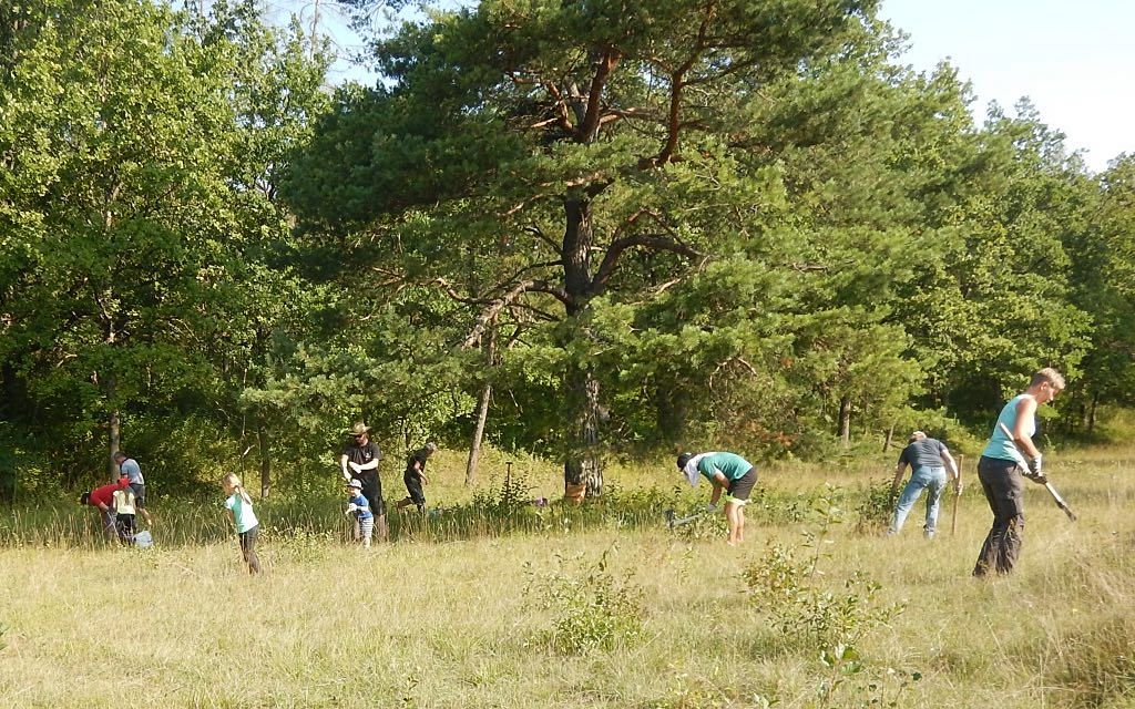 Mit Spitzhacken ging es dabei fleißig ans Werk, in Vorbereitung auf die diesjährige Mahd. Die jungen Sträucher müssen raus, weil sie nach jedem Schnitt stärker ausreiben und die Fläche so zu verbuschen droht.